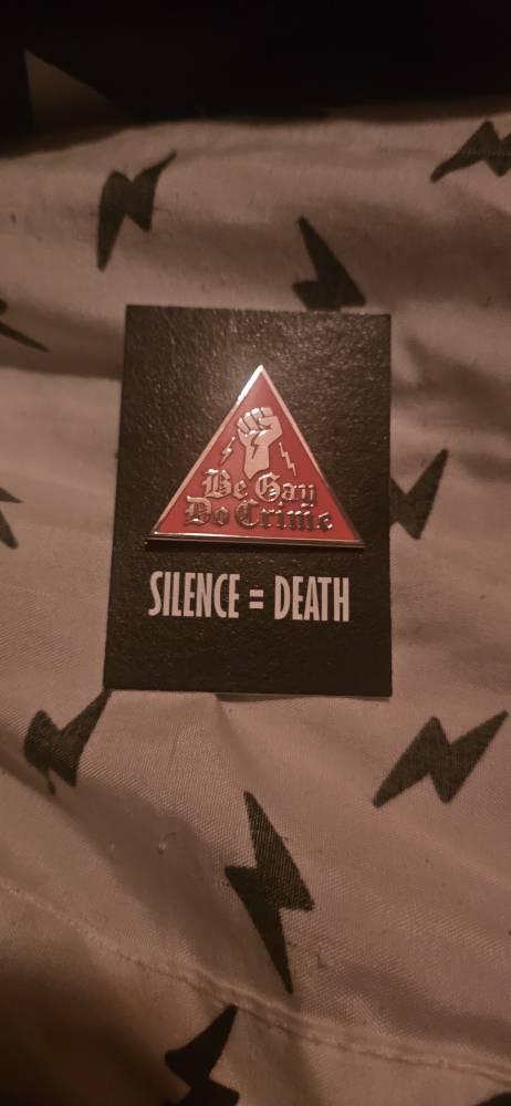 - Pin features a bright pink triangle with the words Be Gay Do Crime in silver.
